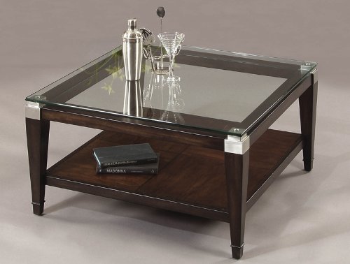 Parquet Oak in Walnut Finish with Brushed nickel corners and floating glass top. Some Assembly Required