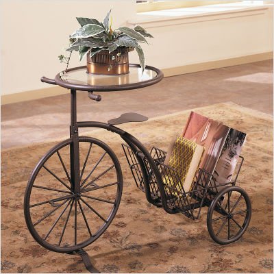 A sure-fire conversation starter, Powell's tricycle table puts a fresh "spin" on room accents. This whimsical piece looks just like an antique child's bike, complete with realistic pedals, seat, and spokes as well as a rustic epoxy painted finish. The inset glass tabletop perches on the handlebars, and a double-sided magazine rack nestles between the back wheels. Adorn the table with cups of coffee and the morning newspaper and it's like you've just received them by special delivery! It's also great for fun display in a kid's bedroom, a foyer, or a family den. The table measures 32-1/4 inches wide by 16 inches deep by 24 inches high. Some assembly is required.