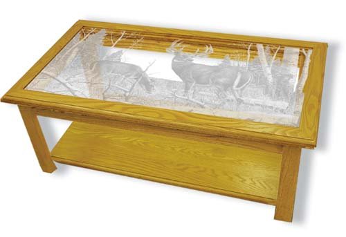 Oak Glass Top Coffee Table With Deer Etched Glass - Deer Coffee Table Furniture - Unique Deer Gift Ideas - Fully Assembled - 39" x 22" x 15" high Feature